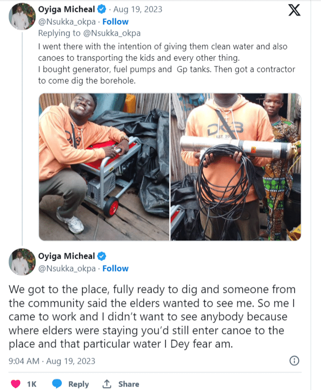 A Nigerian man named Oyiga Micheal has recounted his enigmatic encounter while attempting to construct a borehole in a local community, only to face unexpected challenges that thwarted his efforts.