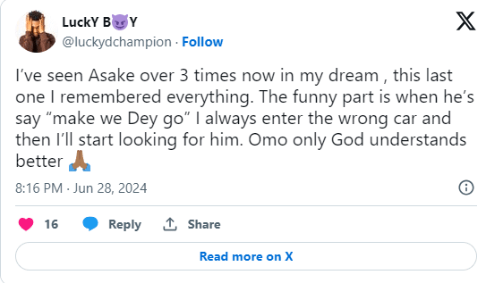 “I’ve seen Asake over 3 times now in my dream , this last one I remembered everything. The funny part is when he’s say “make we Dey go” I always enter the wrong car and then I’ll start looking for him. Omo only God understands better.”