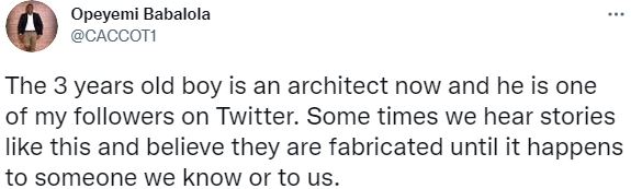 The 3 years old boy is an architect now and he is one of my followers on Twitter. Sometimes we hear stories like this and believe they are fabricated until it happens to someone we know or to us.”