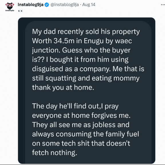 “My dad recently sold his property Worth 34.5m in Enugu by waec junction. Guess who the buyer is?? I bought it from him using disguised as a company. Me that is still squatting and eating mommy thank you at home. The day he’ll find out,l pray everyone at home forgives me. They all see me as jobless and always consuming the family fuel on some tech shit that doesn’t fetch nothing.”