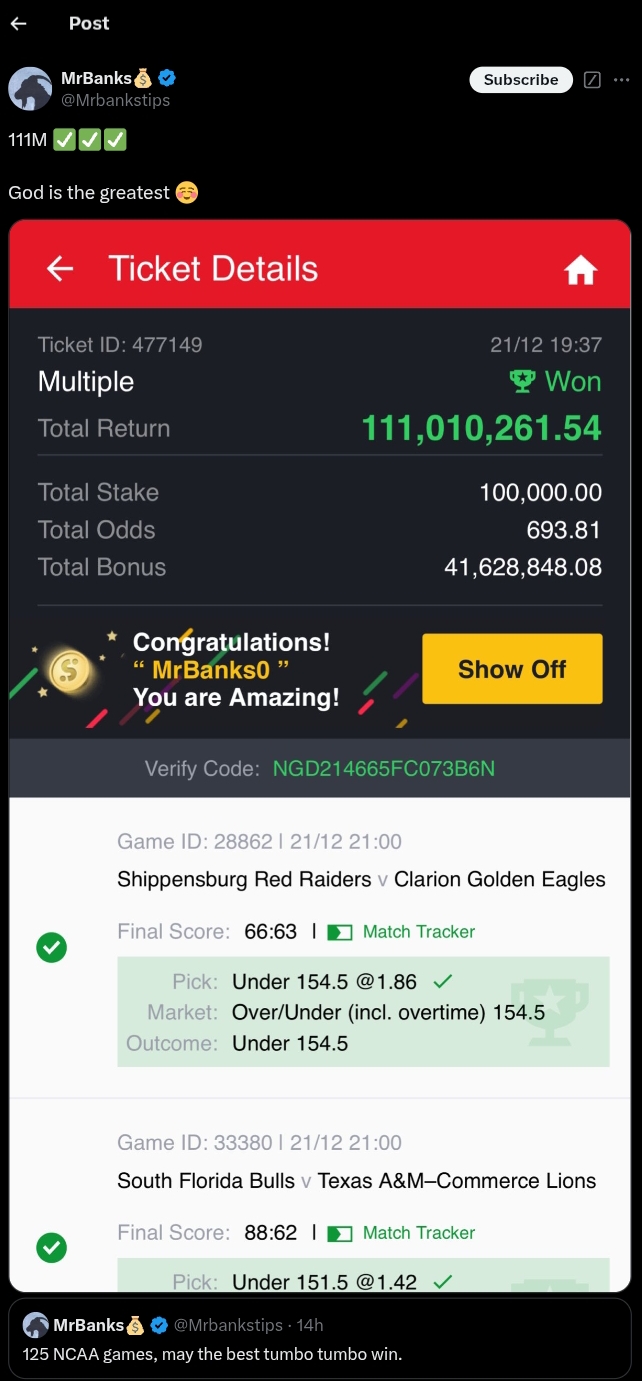 In a post shared via X, formerly known as Twitter, the man, identified as @Mrbankstips, left many in awe as he disclosed his massive win.