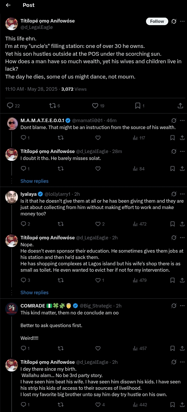 The lady wrote: “This life ehn. I’m at my ‘uncle’s’ filling station: one of over 30 he owns. Yet his son hustles outside at the POS under the scorching sun. How does a man have so much wealth, yet his wives and children live in lack? The day he dies, some of us might dance, not mourn.”
