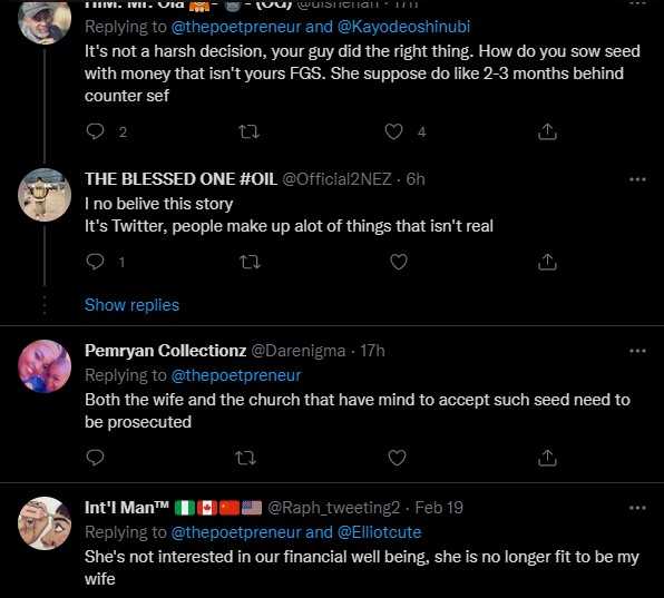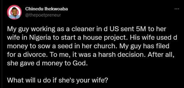 “My guy working as a cleaner in d US sent 5M to her wife in Nigeria to start a house project. His wife used d money to sow a seed in her church. My guy has filed for a divorce. To me, it was a harsh decision. After all, she gave d money to God.