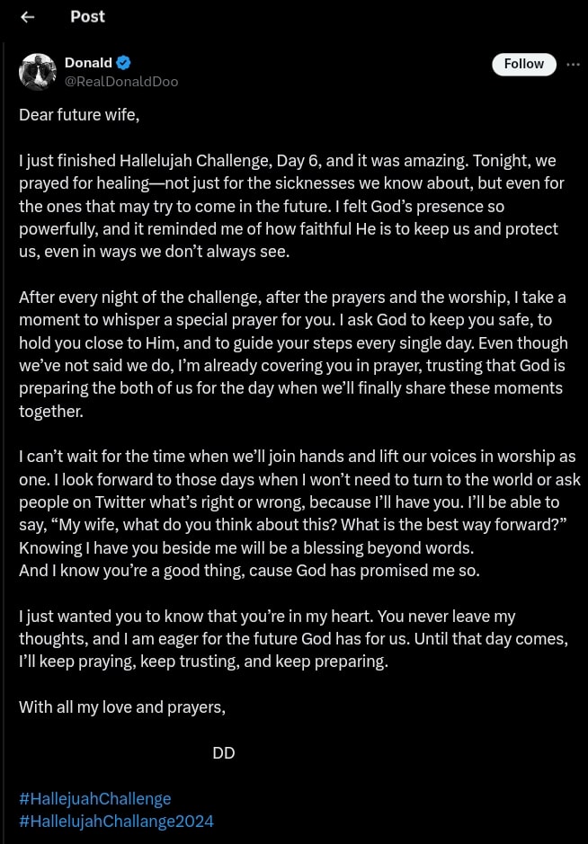 “After every night of the challenge, after the prayers and worship, I whisper a special prayer for you. I ask God to keep you safe, to draw you closer to Him, and to guide your steps daily. Even though we haven’t yet said, “I do,” I am already covering you in prayer, trusting that God is preparing both of us for the day when we will worship together as one.”