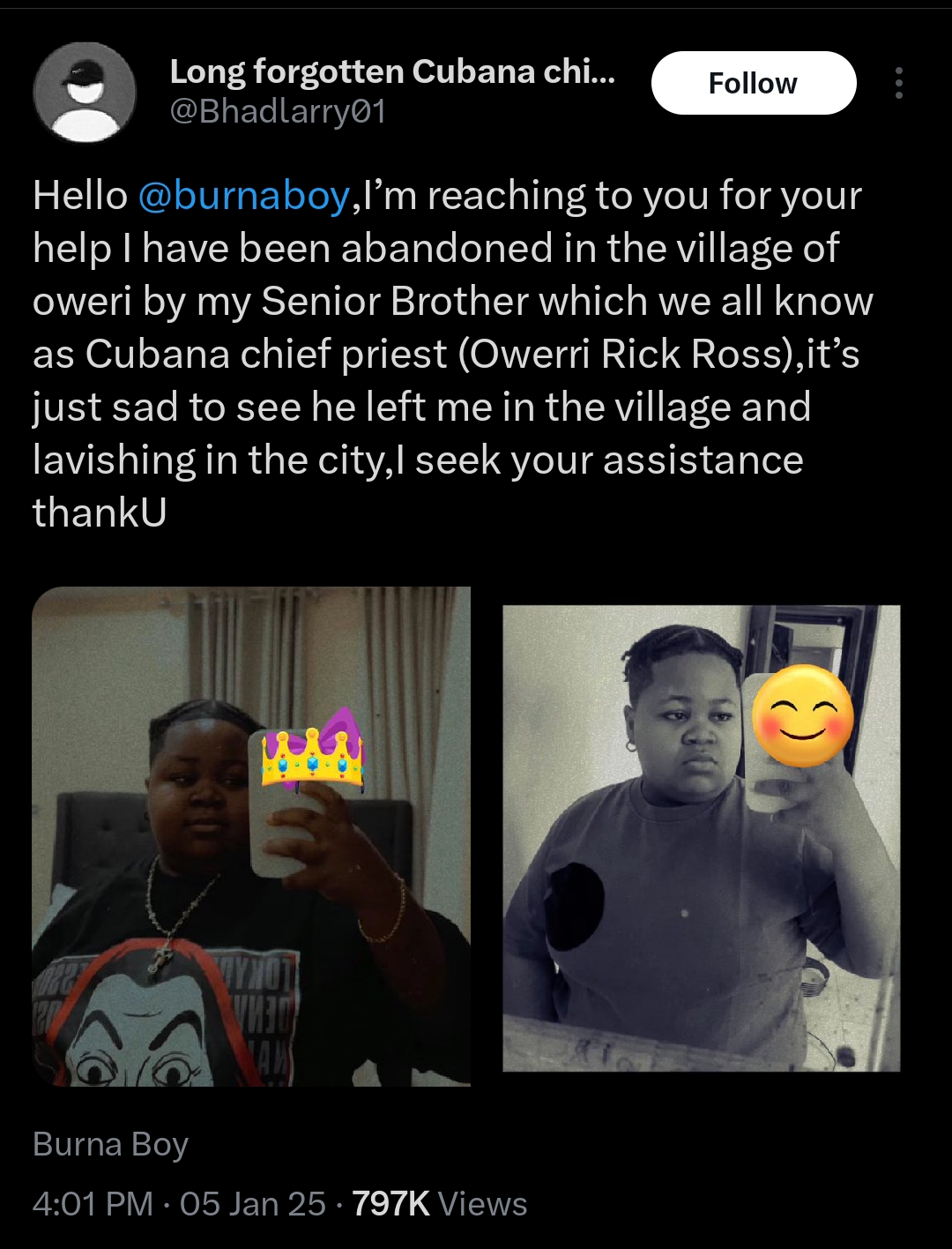 A Nigerian man has written to popular singer Burna Boy for help, claiming that he is the brother of Cubana Chief Priest and has been abandoned in the village.