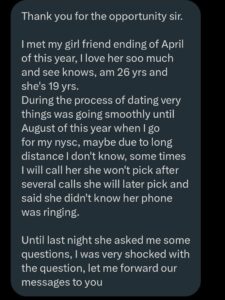 A 26-year-old Nigerian man has sparked a viral conversation online after sharing a shocking confession from his 19-year-old girlfriend, following his departure for NYSC camp.