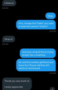 @LaurelChris7: “See as he just dey fall men hands for small girl 😮💨,it was annoying to read. The girl was exercising more authority, oga in the dm,every question she asked you about are things that she has already done, still doing and will still do. You don’t have a girlfriend.”