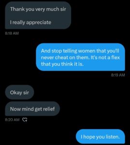 @XlChyno: “She has already told you the secret but lover boy still never pick up the hint. Bruh I’m ashamed of the level of men representing manhood out there, ya’ll are doing a terrible job. She already told you what happened, why are you still asking questions. It’s a pity.”