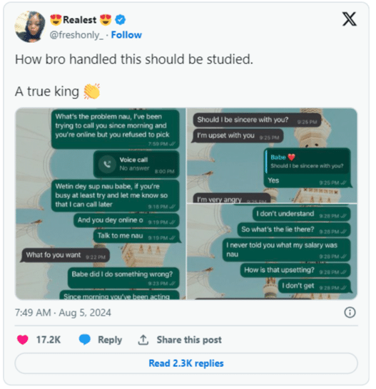 In the leaked chat, the girlfriend, whose previous monthly allowance was N80,000, demanded an increase to N250,000 after discovering that her boyfriend, Kunle, earns N800,000 a month.