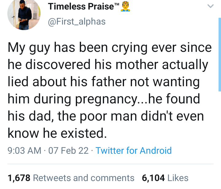 “My guy has been crying ever since he discovered his mother actually lied about his father not wanting him during pregnancy…he found his dad, the poor man didn’t even know he existed,” First_alphas wrote.