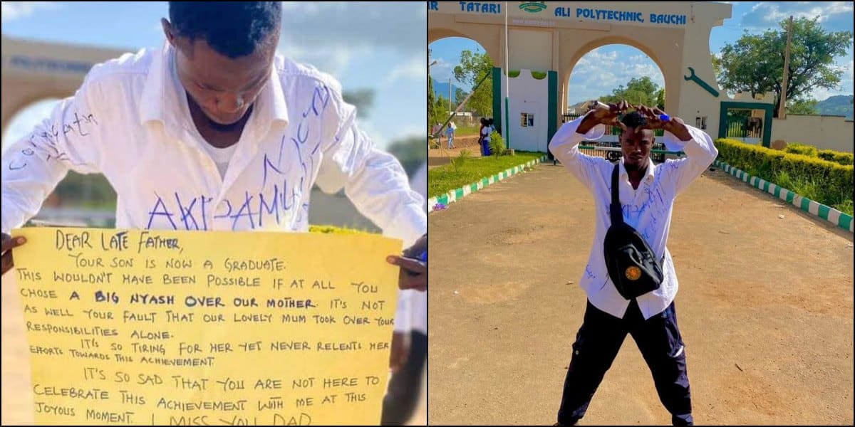 “Dear late father, your son is now a graduate. This wouldn’t have been possible if at all you chose a big nyash over our mother. It’s not your fault that our mother took over your responisibities alone.It’s so tiring for her yet never relents her efforts towards this achievement. It’s so sad that you are not here to celebrate this achievement with me at this joyous moment. I miss you Dad. May your gentle soul continue to rest in perfect peace.”
