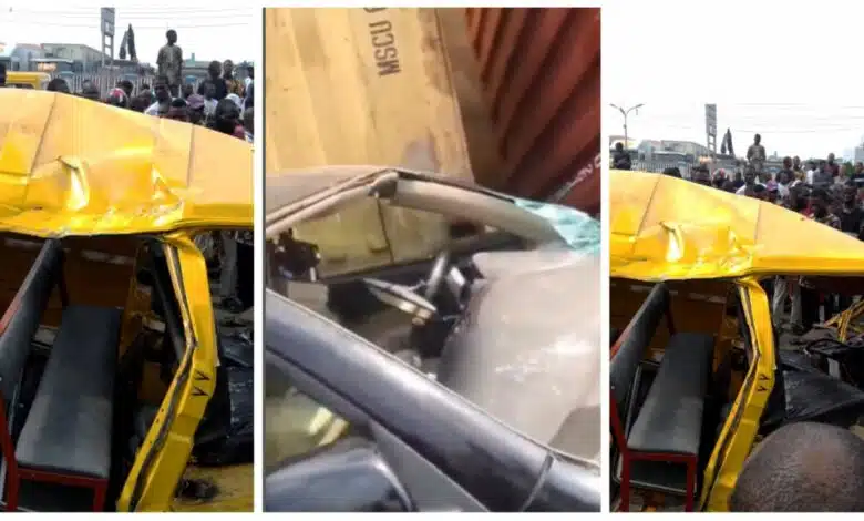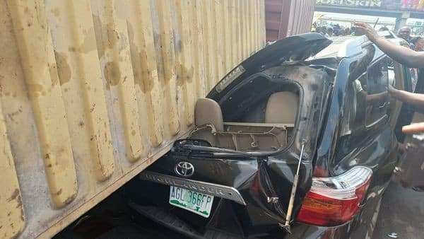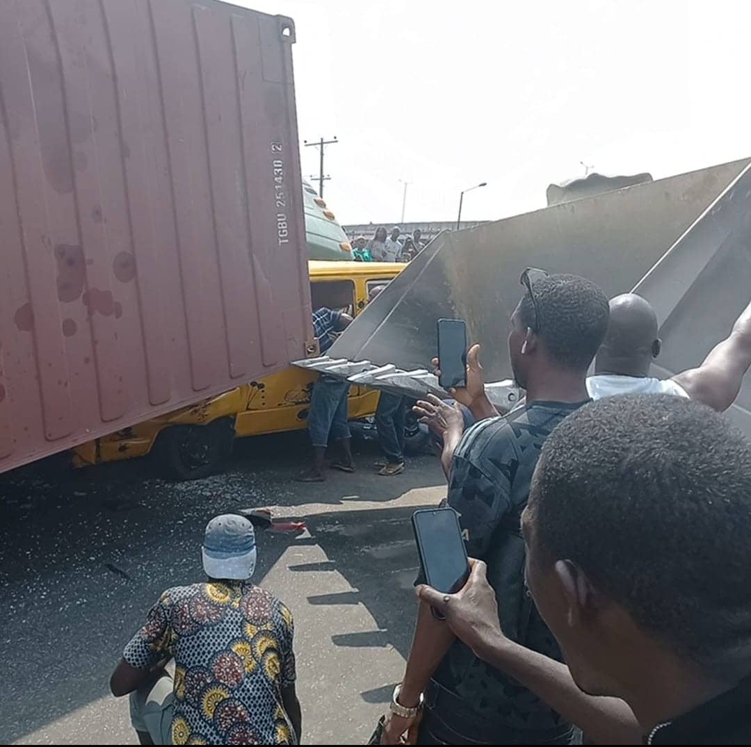 Many people feared dead as a 40-ft container falls on three cars at the Oshodi Apapa expressway, Lagos, today December 22.