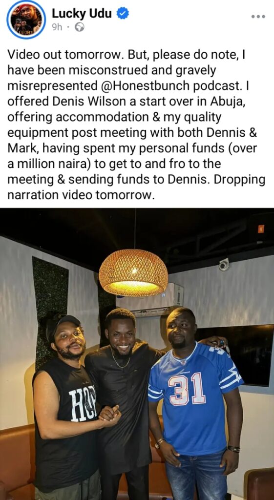 “I offered Denis Wilson a start over in Abuja, offering accommodation & my quality equipment post meeting with both Dennis & Mark, having spent my personal funds (over a million naira) to get to and fro to the meeting & sending funds to Dennis. Dropping narration video tomorrow.,”