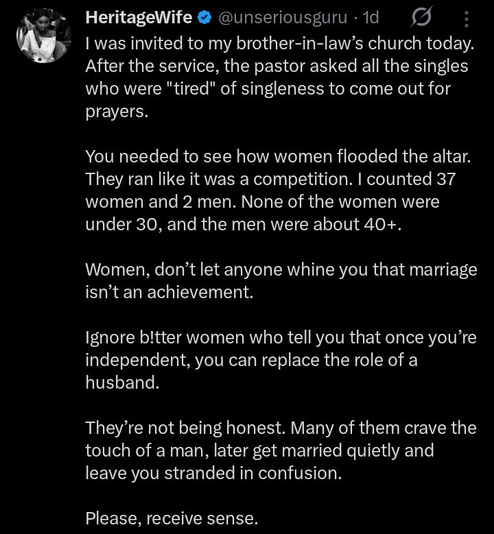 In her viral post, she recounted how the pastor called singles who were “tic-tac” of singleness to the altar for prayers. She observed the crowd closely, noting the overwhelming presence of women.