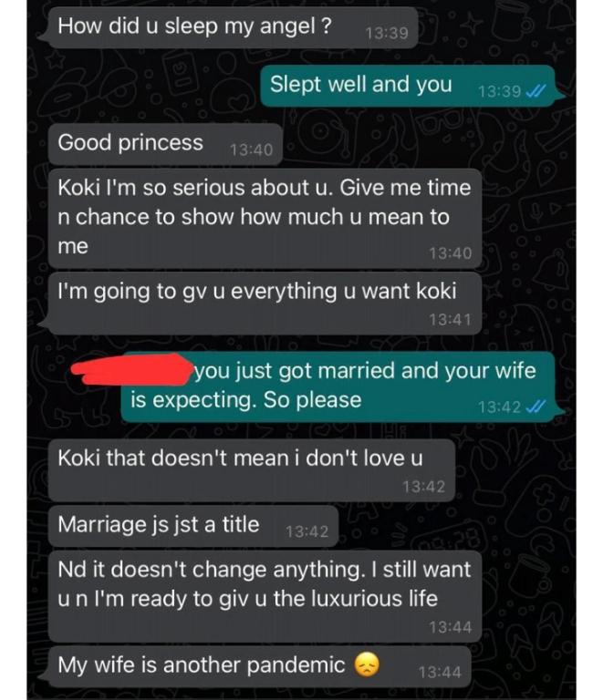 From the chat which she leaked on social media, the married man referred to his wife as a “pandemic”.