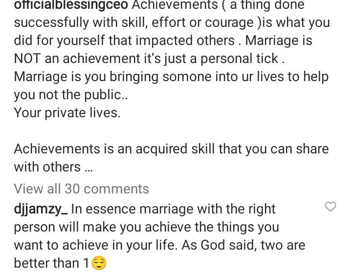 “Achievements ( a thing done successfully with skill, effort or courage )is what you did for yourself that impacted others . Marriage is NOT an achievement it’s just a personal tick . Marriage is you bringing somone into ur lives to help you not the public..