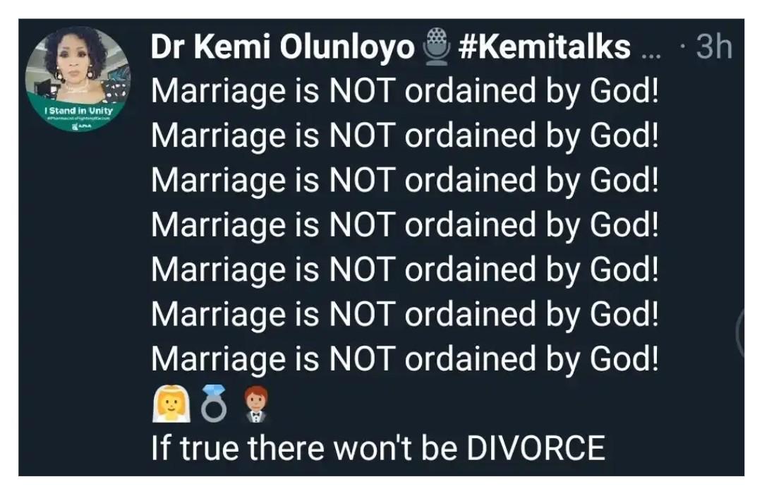 Popular investigative journalist and controversial social media personality, Kemi Olunloyo has stated that marriage was never ordained by God.