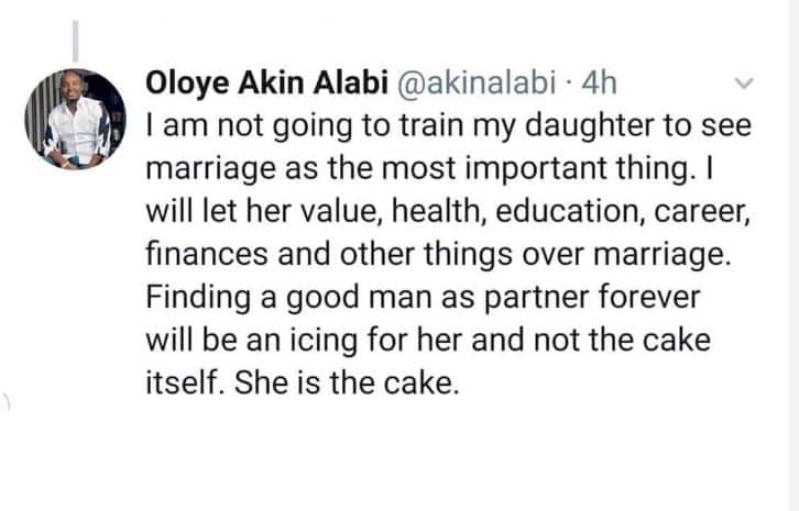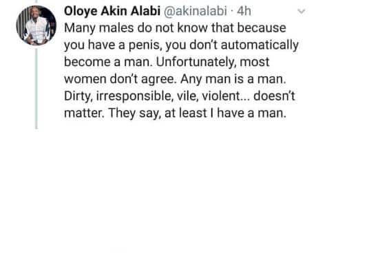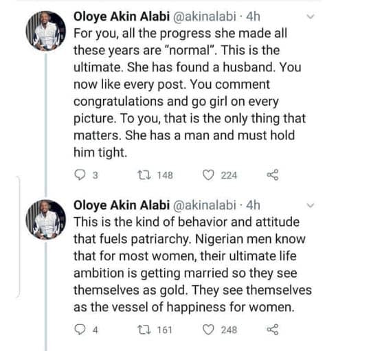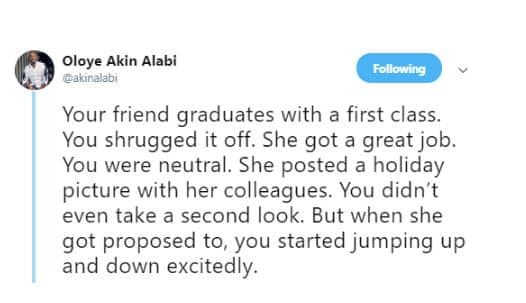 Alabi stated this via twitter, while berating women for going wild celebrating the engagement of their female friends but keep mute when same female friend bags a first class or gets a new job.