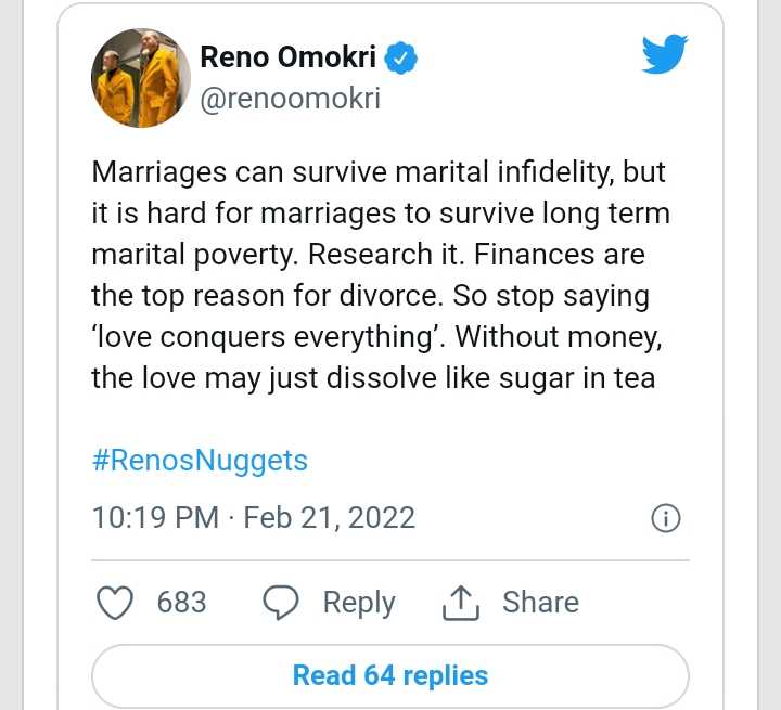 “Marriages can survive marital infidelity, but not marital poverty” – Reno Omokri asserts
