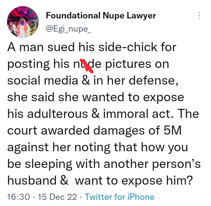 The lawyer identified on Twitter as @Egi_nupe_ revealed that the side chic had reportedly shared the man’s bedroom photos online, prompting the man to take legal action against her and sought compensation for damages.