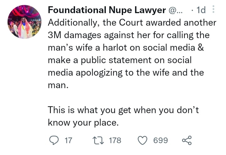 Additionally, the Court awarded another 3M damages against her for calling the man’s wife a harlot on social media & make a public statement on social media apologizing to the wife and the man. This is what you get when you don’t know your place.“