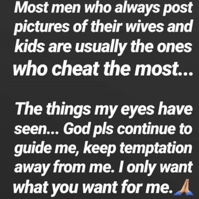 The reality show star further begged God to keep temptation away from her, as she only wants what’s meant for her. Revealing that most married men who post photos of their wives and kids on social media always cheat, Ifu Ennada wrote;