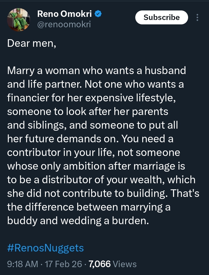 A fresh debate on marriage expectations has erupted online after former presidential aide Reno Omokri shared strong advice to men about choosing a life partner.