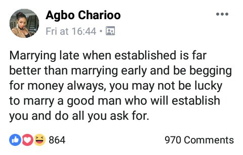 “Marrying late when established is far better than marrying early and be begging for money always, you may not be lucky to marry a good man who will establish you and do all you ask for.”