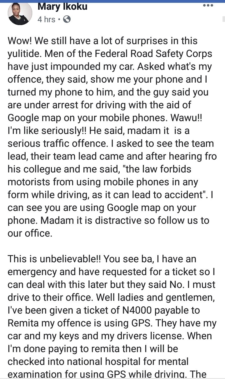 Mary Ikoku, a development consultant, was stopped by FRSC officials in Abuja for driving with Google Map and her car was impounded.