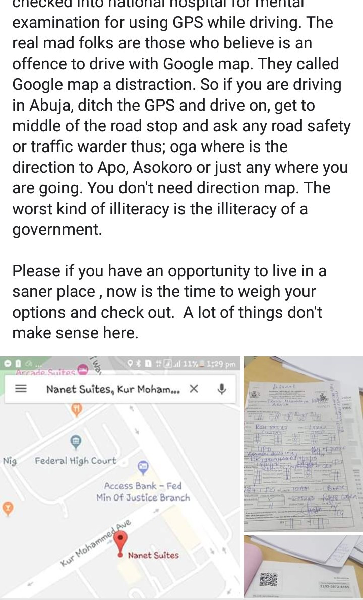 This is unbelievable!! You see ba, I have an emergency and have requested for a ticket so I can deal with this later but they said No. I must drive to their office. Well ladies and gentlemen, I’ve been given a ticket of N4000 payable to Remita my offence is using GPS. They have my car and my keys and my drivers license. When I’m done paying to remita then I will be checked into national hospital for mental examination for using GPS while driving. The real mad folks are those who believe is an offence to drive with Google map. They called Google map a distraction. So if you are driving in Abuja, ditch the GPS and drive on, get to middle of the road stop and ask any road safety or traffic warder thus; oga where is the direction to Apo, Asokoro or just any where you are going. You don’t need direction map. The worst kind of illiteracy is the illiteracy of a government.