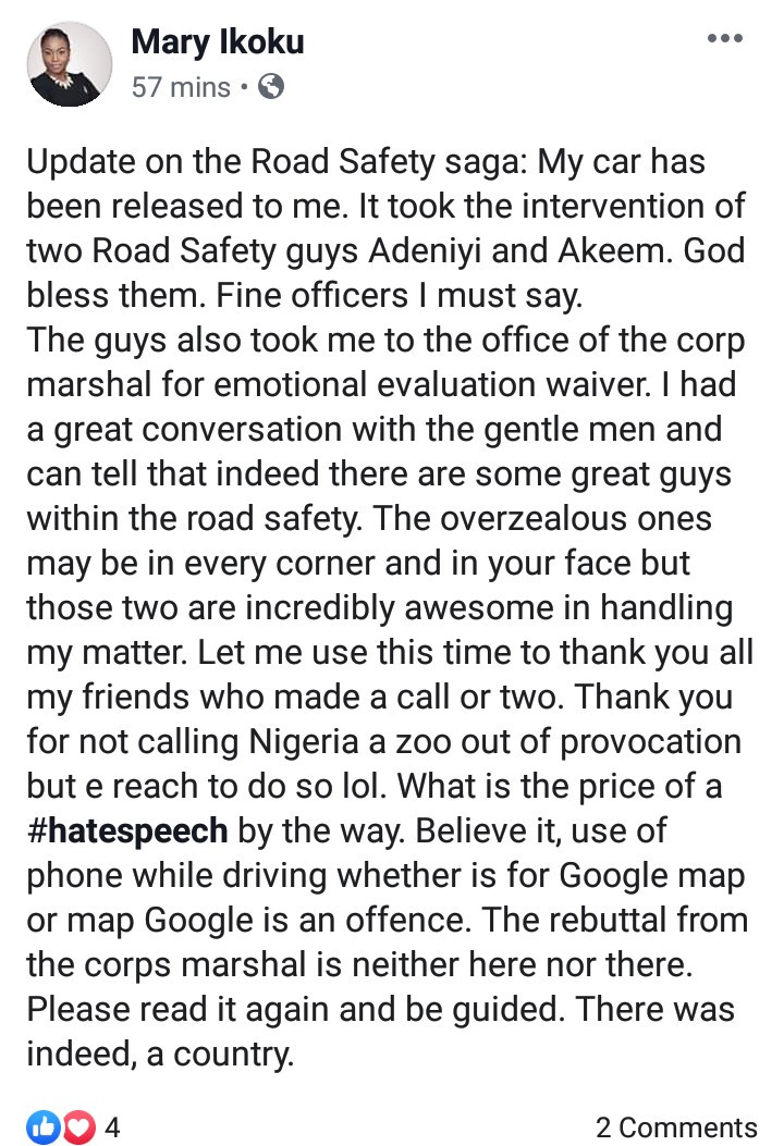 In a new post, she revealed that her car has been released to her after some FRSC officers intervened. The mental evaluation was also waived.