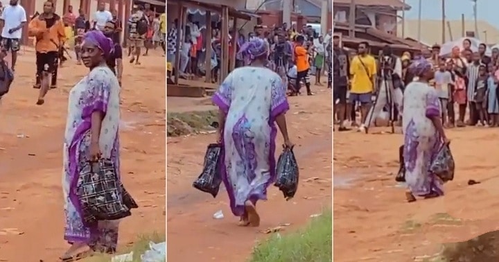 Massive crowd gather as they spot Mercy Johnson with two polythene bags during movie set (Video)