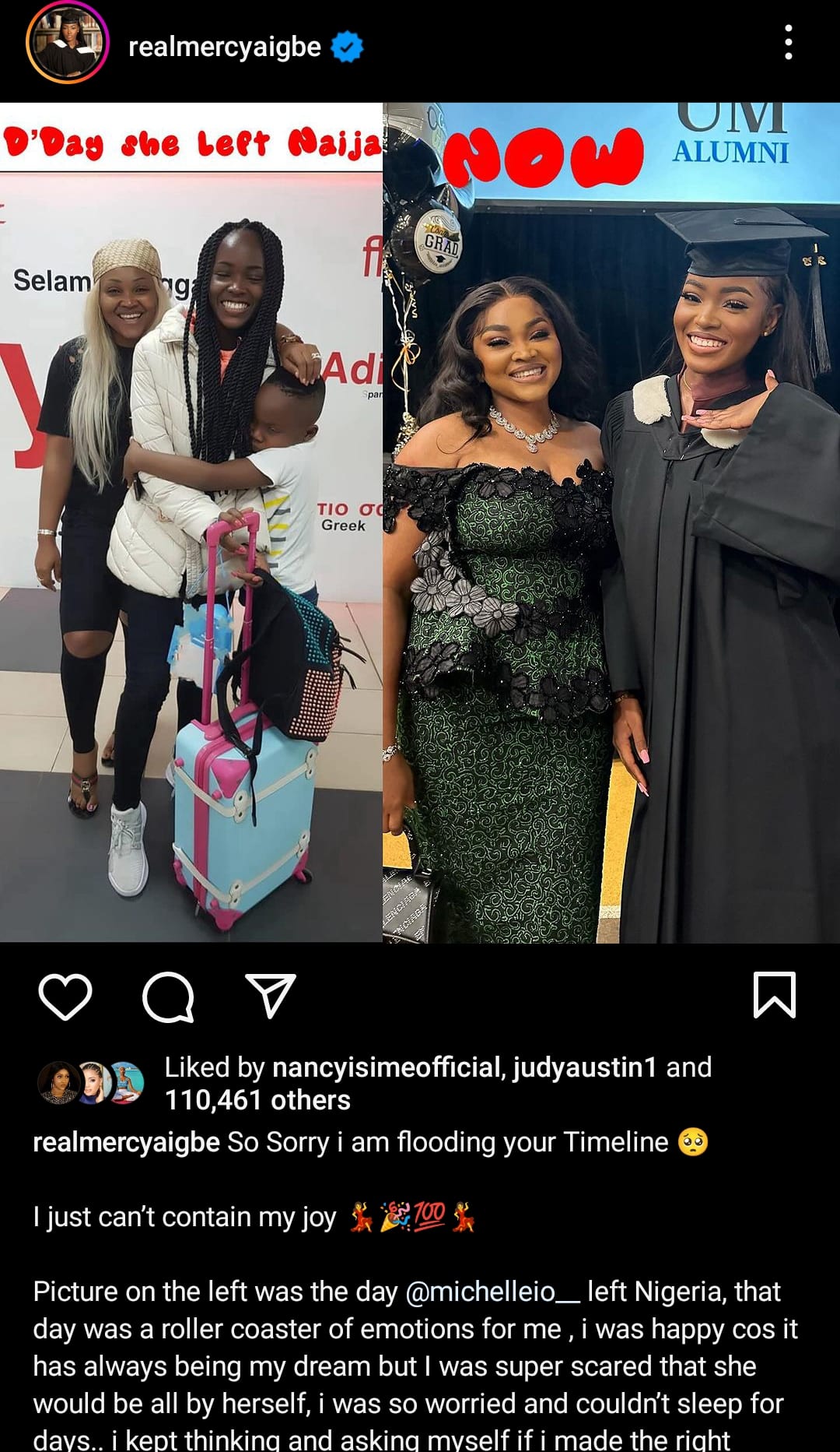 She wrote: “I’m flooding your timeline with joy. The picture on the left was the day Michelle left Nigeria, a day filled with a roller coaster of emotions for me. I was happy because it had always been my dream, but I was also super scared that she would be all by herself in a strange land.”