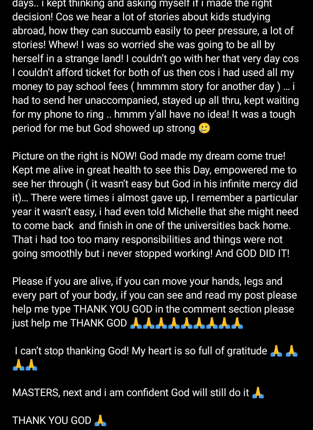 “If you’re alive, if you can move your hands, legs, and every part of your body, if you can see and read my post, please help me type THANK YOU GOD in the comment section. Just help me THANK GOD.”