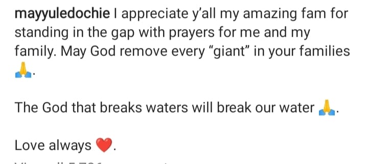 “I appreciate y’all amazing fans for standing in the gap with prayers for me and my family. May God remove every giant in your families. I appreciate y’all my amazing fam for standing in the gap with prayers for me and my family. May God remove every “giant” in your families 🙏. The God that breaks waters will break our water 🙏. Love always ❤️.”
