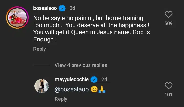 She wrote, “No be say e no pain u, but home training too much… You deserve all the happiness! You will get it Queen in Jesus name. God is Enough!”