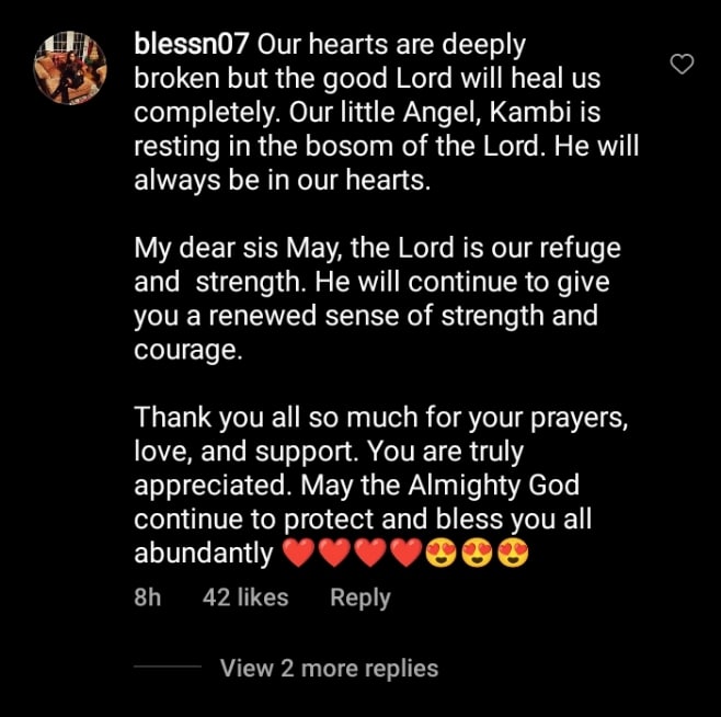 “Our hearts are deeply broken but the good Lord will heal us completely. Our little Angel, Kambi is resting in the bosom of the Lord. He will always be in our hearts. My dear sis May, the Lord is our refuge and strength.