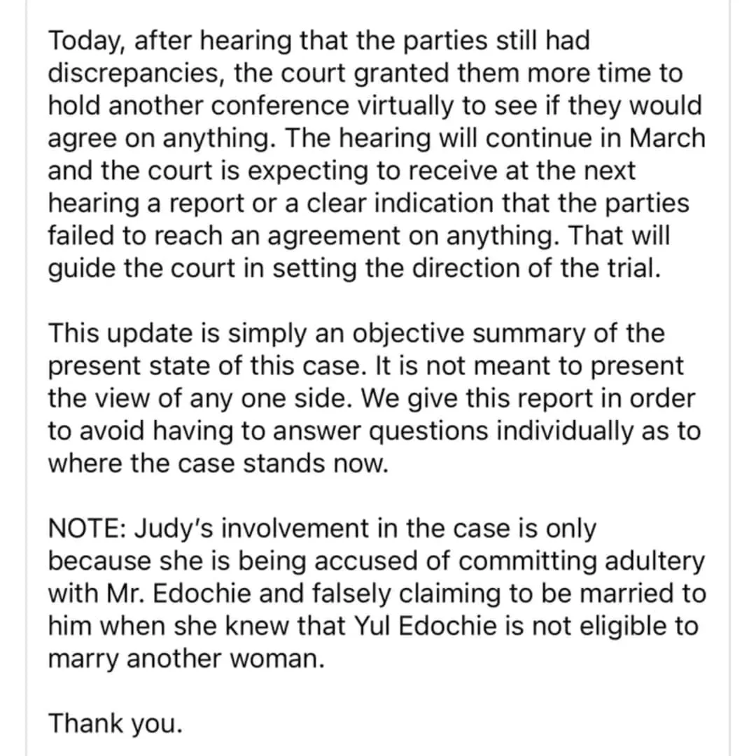 DPA UPDATE ON THE DIVORCE CASE OF MARY YUL-ED0CHIE V. YUL EDOCHIE AND UCHECHUKWU JUDITH MUOGHALU (JUDY AUSTIN)