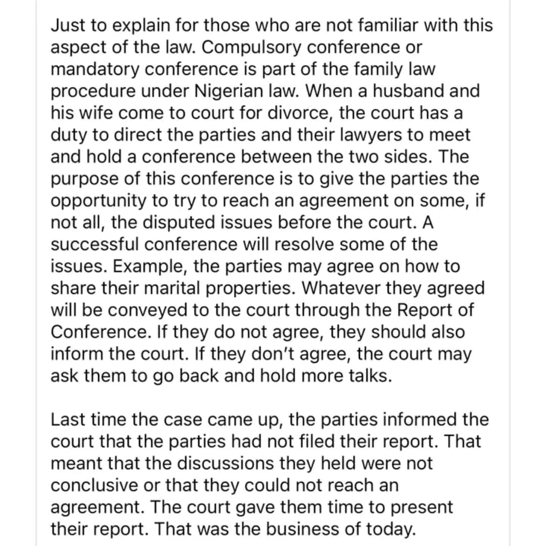 Just to explain for those who are not familiar with this aspect of the law. A compulsory conference or mandatory conference is part of the family law procedure under Nigerian law. When a husband and his wife come to court for divorce, the court has to direct the parties and their lawyers to meet and hold a conference between the two sides. The purpose of this conference is to allow the parties to try to reach an agreement on some if not all, the disputed issues before the court. A successful conference will resolve some of the issues. For example, the parties may agree on how to share their marital properties. Whatever they agree will be conveyed to the court through the Report of Conference. If they do not agree, they should also inform the court. If they don’t agree, the court may ask them to go back and hold more talks.
