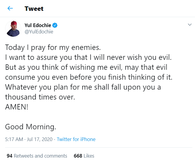 Nollywood actor, film director and politician, Yul Edochie started his morning today by praying for his enemies