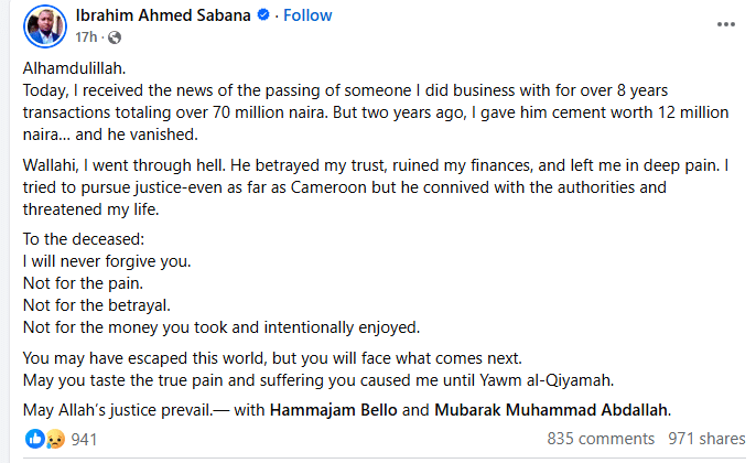 “Alhamdulillah. Today, I received the news of the passing of someone I did business with for over 8 years transactions totaling over 70 million naira. But two years ago, I gave him cement worth 12 million naira and he vanished.
