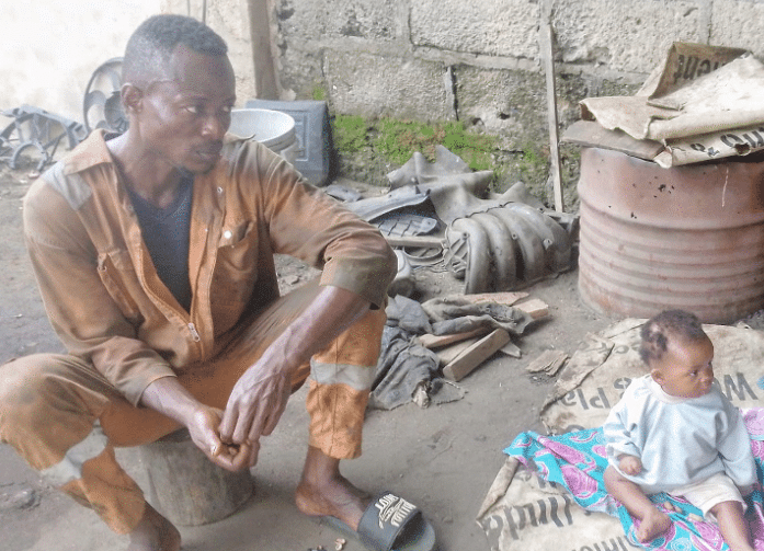 Mechanic who takes little baby to workshop after wife abandoned them receives N285k donations from Nigerians