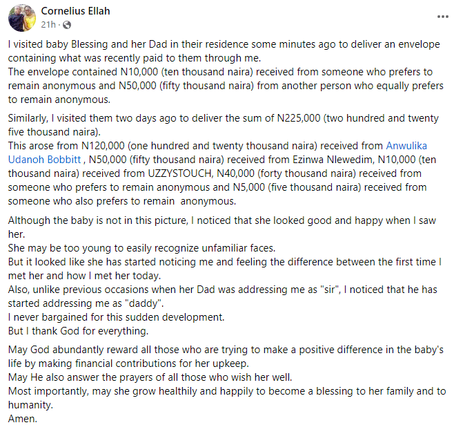 “I visited baby Blessing and her Dad in their residence some minutes ago to deliver an envelope containing what was recently paid to them through me. The envelope contained N10,000 received from someone who prefers to remain anonymous and N50,000 from another person who equally prefers to remain anonymous.”