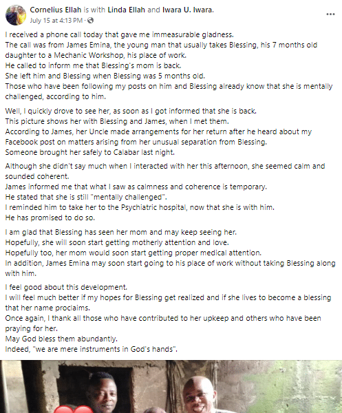 Recently, Cornelius Ellah reported that James’ wife had been safely brought back from Akwa Ibom to Calabar, facilitated by her uncle who responded to the public appeal.