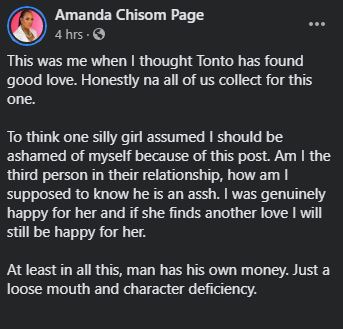 Media personality, Amanda Chisom makes a U-turn as regards her statement about Kpokpogri being the right man for Tonto Dikeh amid the trending saga between Prince Kpokpogri and dancer, Janemena.