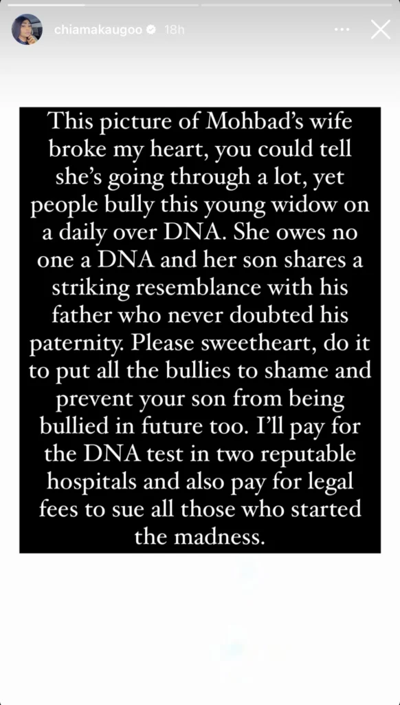 “This picture of Mohbad’s wife broke my heart, you could tell she’s going through a lot, yet people bully this young widow on a daily over DNA. She owes no one a DNA and her son shares a striking resemblance with his father who never doubted his paternity. Please sweetheart, do it to put all the bullies to shame and prevent your son from being bullied in future too. I’ll pay for the DNA test in two reputable hospitals and also pay for legal fees to sue all those who started the madness.”