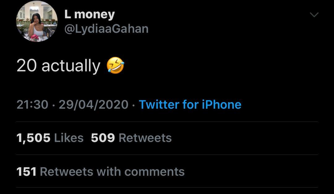 Lydia Gahan in her recent tweet debunked viral rumors that she’s 19. Reacting to the whole drama on Twitter, she wrote; “20 actually” with a ‘laugh emoji’.