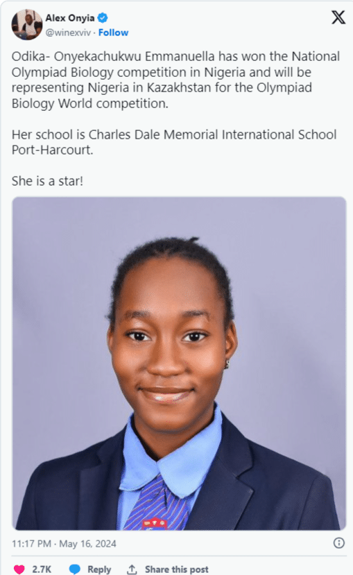 “Odika-Onyekachukwu Emmanuella has won the National Olympiad Biology competition in Nigeria and will be representing Nigeria in Kazakhstan for the Olympiad Biology World competition. Her school is Charles Dale Memorial International School Port-Harcourt. She is a star!“, the post read.