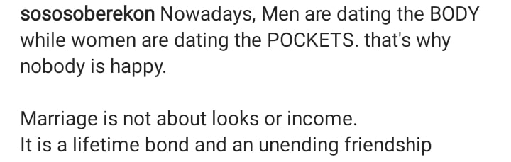 “Nowadays, Men are dating the BODY while women are dating the POCKETS. that’s why nobody is happy.