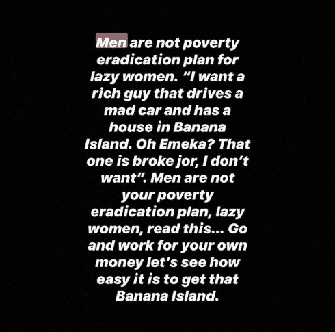 “Men are not poverty eradication plan for lazy women. ‘I want a rich guy that drives a mad car and has a house in Banana Island. Oh Emeka? That one is broke jor, I don’t want.’